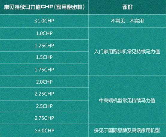 般家用跑步机如果需要满足日常家用,则跑步机电机的持续马力至少需要达到1.0CHP,目前市场常见的持续马力范围请详见下表:
